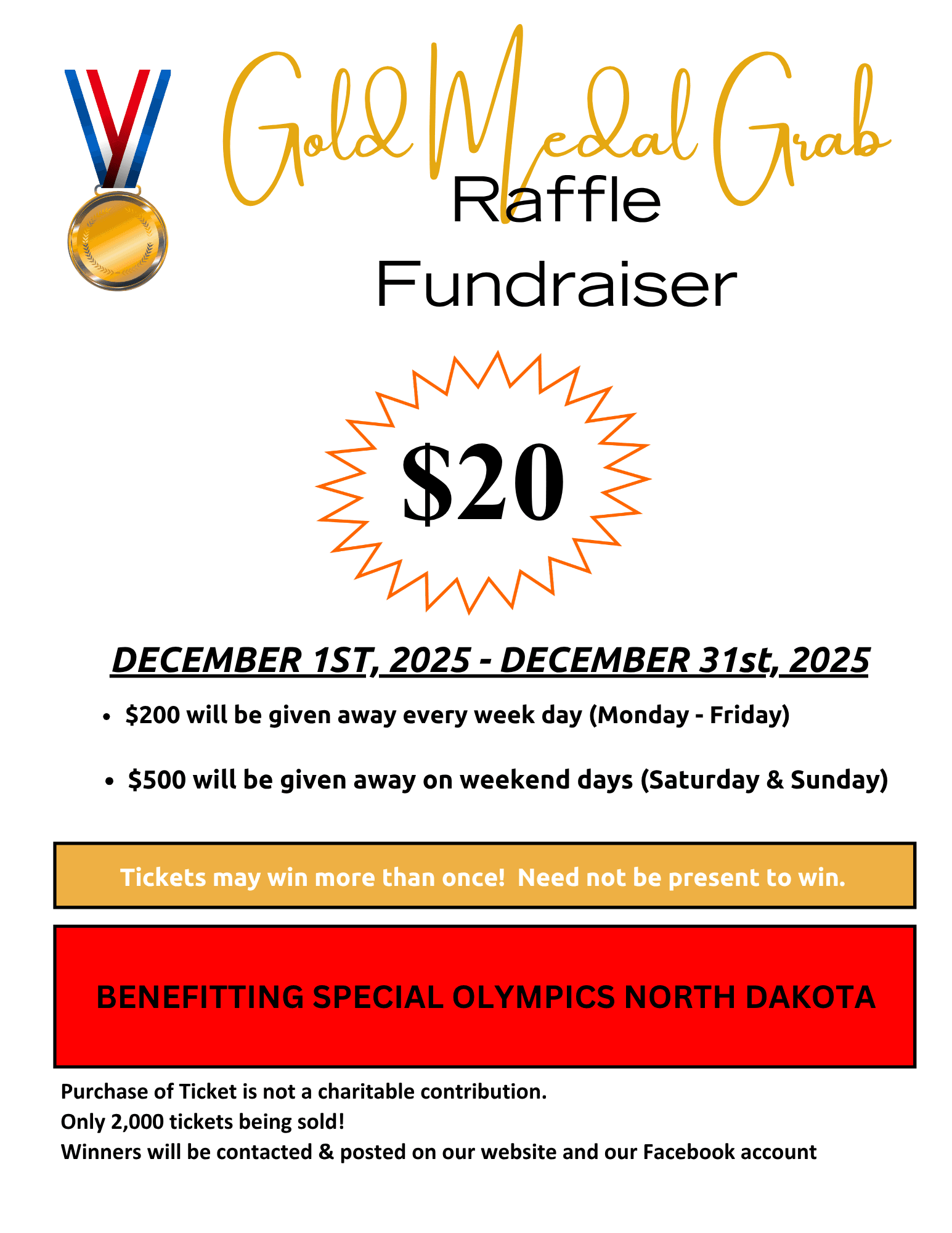 Winners will be drawn at 10:00am each business day, with the results on the page shortly after. Be advised: Ticket may win more than once! Need not to be present to win. Purchase of Ticket is not a charitable contribution to Special Olympics ND, 2616 South 26th St, Grand Forks ND.